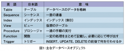 データベースでオブジェクトと言うと、テーブル(table)、インデックス(index)、ビュー(view)などのデータベースに格納される対象物のことを指し、おおむねSQL文の"CREATE ・・・"で作成されます。テーブルや列の情報など、リレーショナルデータベースの管理も自身のデータベースで行います。これらをメタデータあるいはシステムカタログと呼びます。