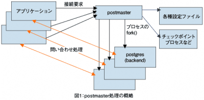 「このプログラムはPOSTGRESシステムに対する要求に対し、交通整理的な振る舞いを行います。フロントエンドプログラムは開始メッセージをPostmasterに送り、postmasterはメッセージ内の情報をバックエンドプロセス設定に使用します。postmasterはPostgreSQLの管理・監視デーモンです」