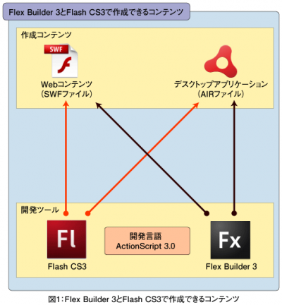 上記の説明にもありますように、Flex Builder 3はFlashコンテンツ作成用のツールとして開発されました。そのため図1のように、Flex Builder 3とFlash CS3で作成できるファイルは同じになります(Flash CS3でAIRアプリケーションを作成するには、Flash CS3をアップデートする必要があります)。