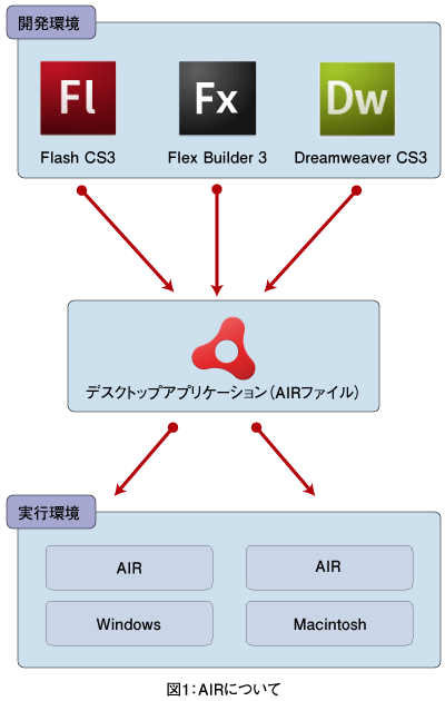 まずは、AIRについて簡単に紹介します。AIR(Adobe Integrated Runtime)とは、アドビ システムズ社が提供しているデスクトップアプリケーションの実行環境のことです。