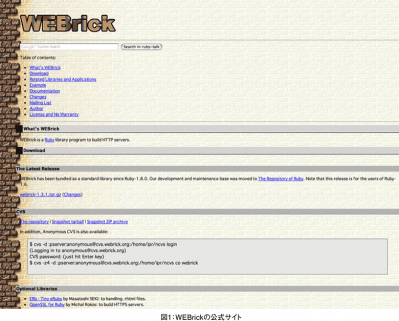 WEBrickはRubyのみで書かれたWebサーバー用フレームワークです。Ruby 1.6では、単独で配布されていましたが、Ruby 1.8以降に標準添付されていますので、Rubyがインストールされている環境には既にインストールされているはずです。