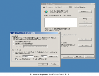 「ローカル エリア ネットワーク(LAN)の設定」ダイアログが開くので、「プロキシ サーバー」の「LANにプロキシサーバーを使用する」にチェックを入れます。アドレスにはプロキシサーバーのアドレスを入力します。同一のマシンで動かす場合には「localhost」を設定します。ポートには「8080」を設定します(図1)。