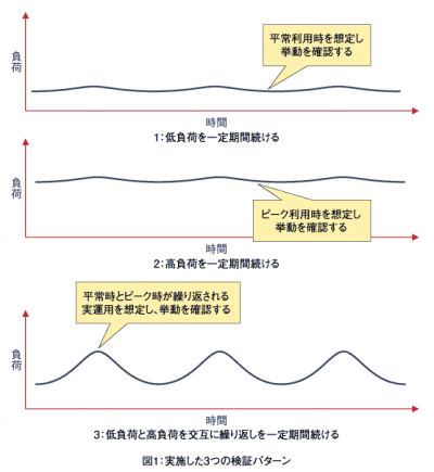 ・平常時とピーク時が繰り返されるような実運用時を想定し、低負荷な状況を一定期間与え続けた後、一時的に高負荷をかけ、その後再び低負荷な状況を作る。それを繰り返し続ける(図1の3)。