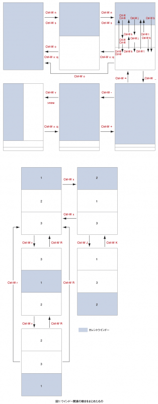 そこで上のウインドーに移動したい時は「Ctrl-W k」と入力、下のウインドーに移動したい時は「Ctrl-W j」を入力する。これは「Ctrl-W Ctrl-W」と動作は同じだが、一番下のウインドーで実行した場合だけ違いがあり、「Ctrl-W Ctrl-W」の場合は一番上のウインドーに移動するのに対し(リングバッファ的な挙動)、「Ctrl-W j」の場合はあくまでも「下」のウインドーに移動する機能なので、そこから移動できなくなる。