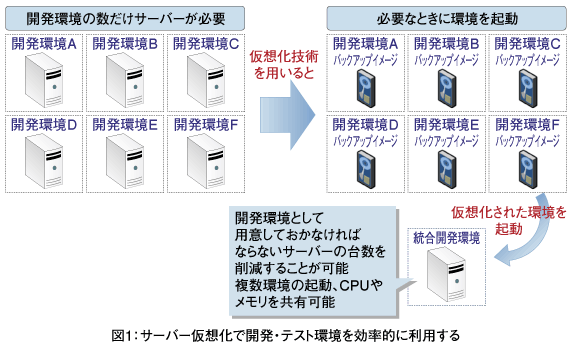 ところが、開発中や本番移行前のテスト以外にその環境が使われることはありません。これは非常に非効率です。とはいっても、必要な時に再インストールして環境を構築することは面倒ですし、リムーバブルHDDを利用して複数環境をHDDの交換によって利用する方法では、同時に複数の環境が起動できません。