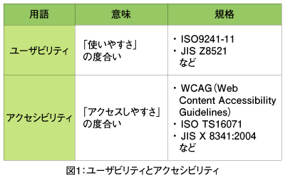まずは、「ユーザビリティ」「アクセシビリティ」の定義について簡単に確認しておきましょう。概要は図1にまとめていますが、それぞれをもう少し掘り下げてみます。
