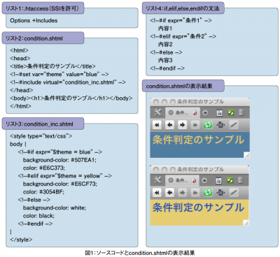 もう1つ、変数に関連した機能に条件判定があります。これは説明だけではわかりにくいので、実際に試してみましょう。前回と同様に、Webサイト内のどこかに実験用のディレクトリを作成し、そこに図1「リスト1」「リスト2」「リスト3」をそれぞれ見出しにあるファイル名で作成してください。リスト2(condition.shtml)をブラウザで表示させると、図1「condition.shtmlの表示結果」の上のように青地の画面になるはずです。
