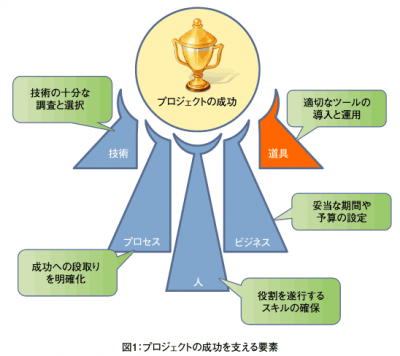 図1に示すように、プロジェクトの成功を支える要素としては、いくつか重要なものがあります。これらの要素が十分に考慮されていない場合には、プロジェクトが失敗するリスクが高まることは、開発プロジェクトに携わっている人であれば容易に想像できるでしょう。すなわち、これらの要素が失敗の原因とならないようにコントロールしていくことが、プロジェクトを成功させるためのカギともなってくるわけです。