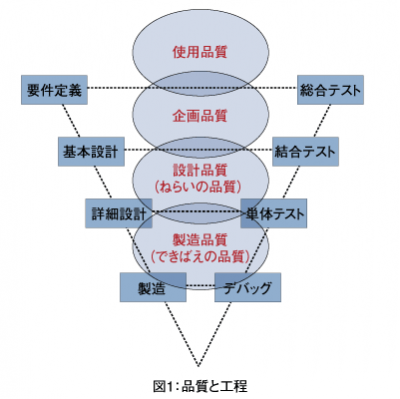 前回までの上流工程ドキュメントにおいても、「品質」について触れました。その際は「顧客満足度の切り口」で解説しましたが、品質には「企画品質」「設計品質」「製造品質」「使用品質」といった工程別に確保するべき品質を定義した考え方もあります。システム開発では、それぞれの品質とそれを確保する工程は図1のようになるでしょう。
