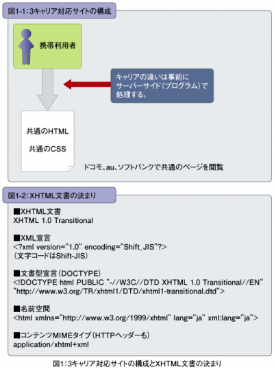 なお、図1-2には、XHTMLの文書宣言に関する基礎事項をまとめました。最近の動向を見ると、使用するHTMLタグはXHTML Mobile Profile(http://developer.openwave.com/ja/tools_and_sdk/documentation/ue11/xhtml-mp-referenceJ/xhtml-mp.htm)に従うのが良いと思いますが、文書宣言ではモバイルの特性なども考えて、TransitionalのDOCTYPEが良いでしょう。