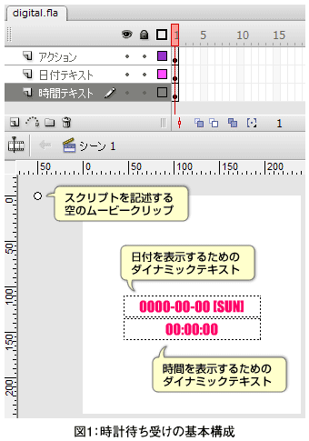 そこで、Flash Liteのコンテンツでよく使われるのが、空のムービークリップです。1つスクリプト動作用に空のムービーリップを作成し、その中のタイムラインで2フレームを確保します。1フレームのみ時計と日付を表示する処理を記述することで、1フレーム→2フレーム→1フレーム…という感じでループアニメーションされることになるので、1フレームに記述されている時計と日付を表示させるためのスクリプト処理が繰り返し実行させることになります。