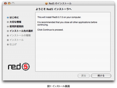 出力に「1.5.0_XXX」または「1.6.0_XXX」と表示されればOKです。Mac環境であれば、ここまで確認できたら後は一般的なソフトウエアとほとんど変わりません。Red5のダウンロードページからインストーラーパッケージがダウンロードできます。ダブルクリックすると図1のようなおなじみのウィザードがはじまりますので、規約に同意していつものようにインストールすると、デフォルトではアプリケーションフォルダにRed5というフォルダができます。