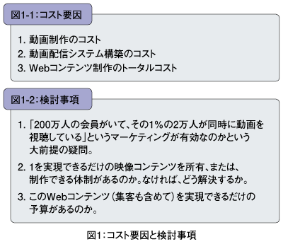 例えば、動画映像の権利をクライアントが持っていて、その映像を利用してコンテンツビジネスを展開しようという場合、第3回(http://www.thinkit.co.jp/article/153/3/)で説明した動画配信の予算・見込みアクセス数などからインフラの規模を検討し、さらにこれらの動画配信インフラに適合した決済システムやユーザー管理システム/DRMシステム構築を査定する必要があります。