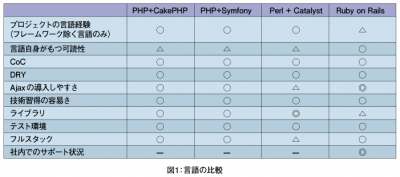 図1をみてください。これは、ずばり今回実際に採用を検討した言語と比較した内容の評価結果(◎:大変よい、○:よい、△:普通、-:なし)です。どうしてこうした評価に至ったのか、またどうして最終的に、一部の項目では△の評価もあるRuby on Railsを採用したのか、選択の決め手を解説します。本記事を読みながら、自分のプロジェクトではどう評価するか、何を決め手とするか一緒に考えてみてください。