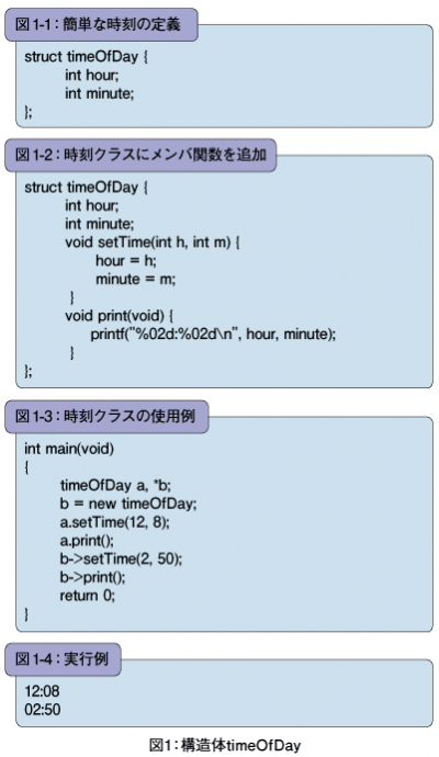 例を示しましょう。C++はC言語をベースにしてオブジェクト指向の機能を実現した言語で、Cの構造体もプログラムの中に記述できます。図1-1は時間と分の2つの整数で時刻を表す構造体timeOfDayです。実は、C++ではこれでオブジェクトを定義したことになります。