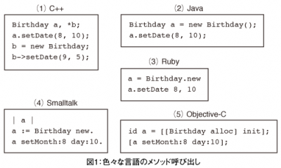 (5)はObjective-Cですが、この言語はSmalltalkからいろいろな要素を受け継いでおり、メッセージの送り方も似ています。メッセージ送信はカギ括弧で囲んだ中に、受け手のオブジェクトとメッセージ名、引数を書き、全体は式となります。引数が複数個ある場合、何番目の引数が何を意味するのか忘れてしまうことがよくありますが、(4)、(5)の流儀では引数の意味がはっきりするので助かります。読みやすいかどうかは好みが分かれるかもしれません。