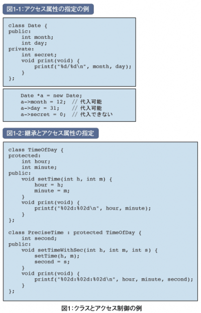 図1-1に簡単な例を示します。publicにするメンバの前にpublic:という指定を置きます。この指定は別の種類の指定が現れるまでずっと有効になりますので、データメンバmonthとdayはpublicになり、secretはprivateになります。secretに対してオブジェクトの外部から代入を行おうとするとコンパイル時にエラーとなります。
