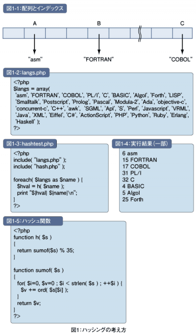 図1-1のように、例えば"asm"は配列のAの場所に、"FORTRAN"はB、"COBOL"はCというように、その名前で格納する場所を決めるのです。これがハッシング(hashing)の考え方です。