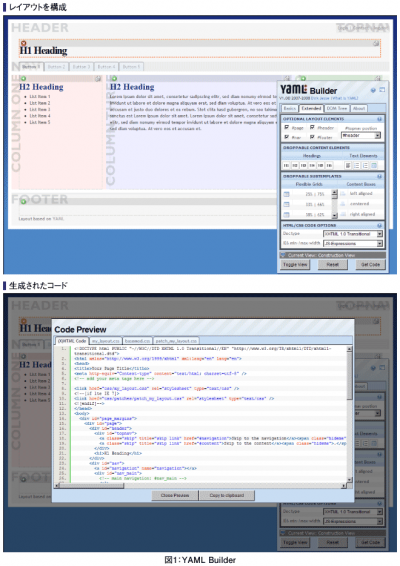 YAMLはまず豊富なドキュメント群(http://www.yaml.de/en/documentation/basics/general.html)が魅力です。CSSそのものの勉強になるところあり、興味のある方はご覧になってみてください。また、YAML Builder(http://builder.yaml.de/)というオンラインのツールがとても強力です(図1)。ブラウザ上でレイアウトをデザインすると、YAMLベースで構築されたHTMLとCSSのひな形を取得することができ、HTMLやCSSをゼロから書く必要はありません。