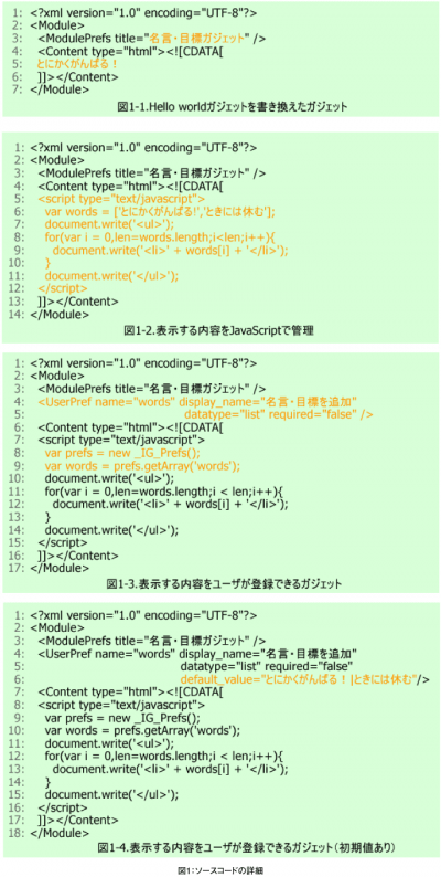 さて、このガジェットをベースに、機能を拡張していきましょう。「名言、目標ガジェット」なので、できれば複数の言葉を表示したいところです。そこで、表示する言葉をJavaScript上で配列で管理し、ガジェット表示時にdocument.writeで書き出してみます(図1-2)。XMLファイルはこちら(http://www.chrisryu.com/data/thinkit/gadget001/sample002/lessons.xml)です。