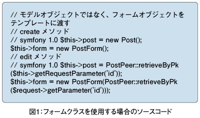 1がcreate、editアクションで、2以降がupdateアクション内に実装されています。フォームクラスを使用する場合はソースコードは図1のように変える必要があります。