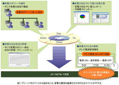その原因は、ポリシーの不在と、意識の低さにある。「省電力ポリシー」は、字のごとくPCの省電力設定の徹底を促すものだ。近年ではCRTモニターから液晶モニターへの移行が進み、ディスプレイを使用する上での消費電力は減った。一方PCメーカーも省電力マシンを市場に提供している。とはいえ、電源のつけっ放しは、電力の無駄遣いであることに変わりはない。JP1では、こうしたオフィスのクライアントPCに対する省電力支援など運用面から始めるグリーンITの実現を支援している。