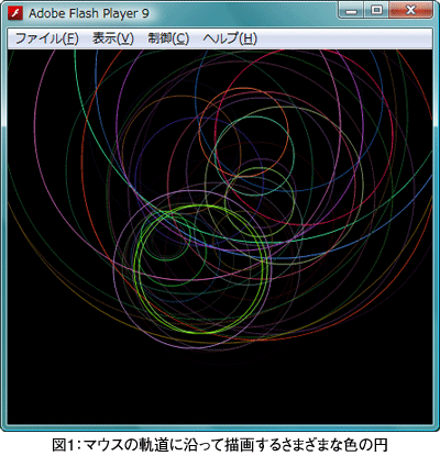 このように、サンプルではマウスの軌道に沿ってさまざまな色の円が描画され、その円は大きくなっていきます。そしてある程度大きくなったところで、円は消えます。