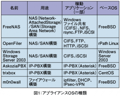 それでは、どのようなアプライアンスOSがあるだろうか。いくつか挙げてみたのが、図1だ。アプライアンスOSは、何かしらのOSをベースに作られていることが多い。これは、ゼロからOSを作るよりはるかに楽にOSを作ることができるからである。