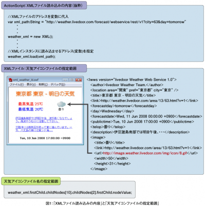 さて、インターネット上にあるXMLファイルを読み込む方法ですが、図1の「ActionScript : XMLファイル読み込みの内容(抜粋)」にありますように、ActionScriptで読み込みたいXMLファイルのアドレスを「XMLオブジェクト名.load」で指定するだけで、ほかの記述内容は、1回~3回の記事に掲載したと同様の方法で行うことができます。