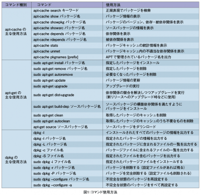apt-getには、前回紹介したupdateやupgradeなど、ほかにも多くの動作オプションが用意されています。図1に、主な使用方法を記しました。詳しくは、man 8 apt-getコマンドでマニュアルを参照してください。