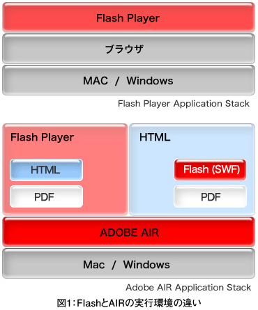 AIRは、Adobe AIRというランタイムをOSにインストールすることで、制作したコンテンツをデスクトップ上で動作させています。また、Adobe AIRにはHTMLを表示するためのエンジンと、Flashコンテンツを動作させるためのエンジンが内蔵されているので、Webブラウザやプラグインを意識せずに、制作したコンテンツをデスクトップ上で利用できるようになります。