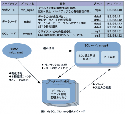 今回はMySQL Clusterのセットアップ方法について説明します。MySQL Clusterを構成するノードには「管理ノード」「データノード」「SQLノード」の3種類のノードがあります。