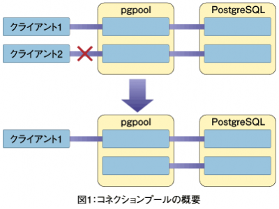 コネクションプールとは、クライアントからpgpool-IIへの接続が切断した時、pgpool-IIからPostgreSQL間の接続を保持し、後で新たにクライアントからの接続要求を受けた時に再利用することで、接続によるオーバーヘッドを軽減する機能です。