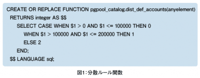 例えば、キーの値が100000までであればノード0に、200000までであればノード1に、それより大きければノード2に振り分けるような分散ルール関数は、図1のようなSQL関数として定義することができます。