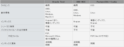 商用のDBMSに、高度な全文検索機能が装備されたことは、連載の第1回にも記載しました。DBMSに対する全文検索は、DBMS本体での実現のほか、サードパーティによる外部モジュールでの対応もありますが、これはSQL文とは異なる個別のインターフェースを用います。ここではLudiaと同様に、SQL文でデータベース内の全文検索を行えるDBMS標準の機能のいくつかを比較します。 注1:V-gram: N-gramの拡張方式 | ||||||||||||||||