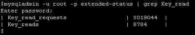作成したindex_passにアクセスして、負荷をかけてみます。mysqlコマンドラインから、以下のようなコマンドを数度実行してください。なお、{PASSWD}は、実際にデータベースに登録されているものをいくつかピックアップしてください。 mysql> select * from test.http_auth where pass='{PASSWD}';負荷をかけた後で、以下の項目を確認してください。 各項目は以下の通りの意味を持ちます。