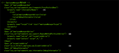 実際にはデバッグ文は改行されず1行で出力されます(上記の例だと2行)。 以上でAdviceの実装は終わりです。以外にあっけなくできあがりましたね。 次にBean定義ファイルを修正します。トレースログの出力処理と例外処理を利用できるように修正した部分を解説していきましょう。 リスト11はBean定義ファイルにEmployeeManager用のAOPを設定した部分です。 リスト11:EmployeeManager用のAOP設定 リスト11の(3)は、例外用に作成したExceptionAdviceとSpringが提供するDebugInterceptorのBean定義です。 リスト11の(2)は、ExceptionAdviceとPointcutを1つにまとめたAdvisorの定義です。EmployeeManagerのすべてのメソッドを例外処理の対象とするためPointcutの条件に「.*.(すべてのメソッド)」を設定しています。 なお、DebugInterceptorにはAdvisorが必要ないことに注意してください。Springが提供するInetrceptorクラスはAdvisorなし(つまりPointcutなし)で使用することが可能です。その場合はターゲットとなるすべてのメソッドにInetrceptorクラスが適用されます。 リスト11の(1)で、ProxyFactoryBean(ProxyFactoryBeanについては本連載の「第4回:Springの導入によるDIの実現」を参照してください)をAOPとして追加する処理をします。また、リスト11の(2)までで定義したAdvisorとDebugInterceptorをAOPのtargetとして、今まで宣言トランザクションの対象としていたBean定義ファイル内でemployeeManagerTagetというidが付加されていたEmployeeManagerImplを設定しています。 AOPの設定の最後は、トランザクションの対象としてリスト11の(1)の設定で付加したid"employeeManagerAOP"をトランザクションの対象とすることです(リスト12)。 リスト12:EmployeeManager用のトランザクション設定 |