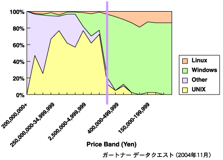 それでは、エンタープライズサーバOSとしての可能性が注目されているLinuxはどうなのだろうか。もう一度、グラフを見てみよう。 |