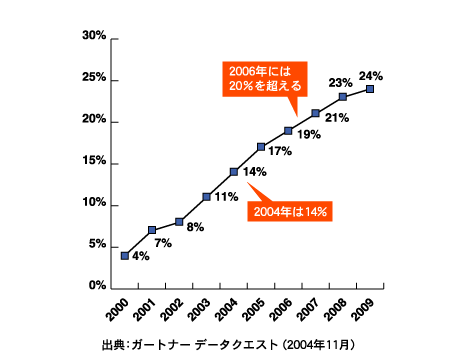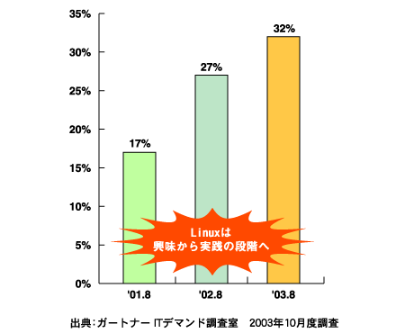 とは言え、ガートナージャパンの調査結果の推移を見てみると、Linuxの「利用中/導入中」は、2001年の17パーセント、2002年の27パーセント、そして2003年の32パーセントと確実に右肩上がり(図4)。亦賀氏も、Linuxは、これまでの“興味”から、“実践”の段階へと移行したと分析する。 |