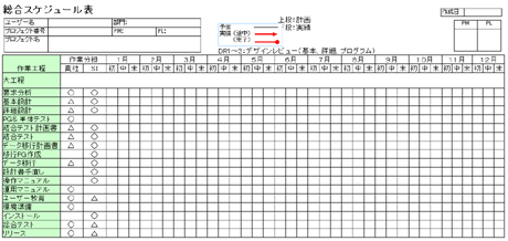 表4Aと表4Bは、どちらもPYRAMIDにおける「機能別スケジュール表」のテンプレートです。表4Aは期日管理型、表4Bは矢印管理型のフォームとなっており、どちらを使っても良いことになっています。また、両方を組み合わせたフォームを作成して使っているPLもいます。これらのスケジュール表は、担当者単位で進捗を管理・フォローする目的で使われるもので、一般に「進捗管理表」と呼ばれているスケジュール表もこれに相当します。また、PYRAMIDではMS-Projectなどのツールを使っても良いことになっています。 |