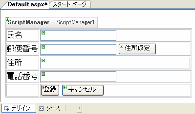 デザイン表示に切り替えたときに、図2のように表示されれば問題ありません。 ![]() 図2:今回使用するページ また、住所仮定ボタンのイベントハンドラに下記のコードを追加してください。 住所仮定ボタンのイベントハンドラのコード(C#)