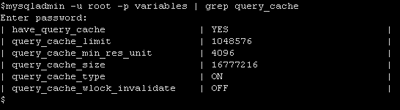 MySQLサーバには、MySQLクライアントからのクエリとその実行結果をキャッシュし、次回から同じ内容のクエリが要求された場合にキャッシュから応答する、クエリキャッシュという仕組みがあります。キャッシュから応答させることによってデータベースへアクセスする負荷を軽減し、また応答速度自体の向上も狙ったものです。 デフォルト状態ではクエリキャッシュを使用しない設定になっています。以下のように現在の「クエリキャッシュに使用するメモリ量の最大値」であるquery_cache_sizeを確認してください。 デフォルトでは0Mbytesに設定されていて「クエリキャッシュを使用しない」という状態であることがわかります。なおshow variablesで表示される単位はkey_buffer_size同様bytesです。 |