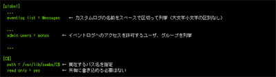 この機能はSamba 3.0.20で追加されましたが、Samba 3.0.21のリリース時に大幅なパラメータの統廃合が行われたため、ここではSamba 3.0.21の新機能としてあつかいます。Samba 3.0.21以降ではいくつか設定が必要なものの、図1のようにUNIX上のログファイルをWindowsのイベントログのインターフェースを経由して参照する機能が追加されました。 それではMessagesというカスタムログを作成する場合を例に取り、設定方法について簡単に記載します。カスタムログを作成するには「smb.conf」で下記のようにeventlog listパラメータやadmin userssパラメータ、C$共有の設定を行う必要があります。 smb.confファイルの設定 複数のカスタムログを作成する場合は「eventlog list = Messages Syslog」のようにスペースで区切って列挙してください。C$共有は存在さえしていればよく、読み取り専用、中身は空で構いません。これにより、Windows側からadmin usersで指定されたユーザやグループでアクセスすることでSambaが提供するイベントログを参照することが可能になります。 Sambaが提供するイベントログにデータを入力する際は、eventlogadmコマンドを用います。このコマンドは、下記のようなフォーマット(以下、eventlogadmフォーマット)のエントリが列挙されたテキストファイルを標準入力から読み込み、引数で指定されたカスタムログにデータを出力します。 エントリの例(Samba 3.0.21用)