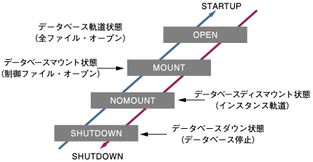 Oracle では、データベースの稼動状態として以下のような4 つの状態が存在します。通常では、停止状態である「SHUTDOWN」か、稼動中である「OPEN」の状態になっていると思います。「NOMOUNT」や「MOUNT」状態にするのはデータベースをメンテナンスするような場合に、このような状態にします。 ![]() |