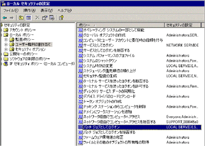 サーバーが、ドメイン・コントローラーの場合は、「ドメインコントローラーセキュリティポリシー」を選択してください。 ![]() ![]() 設定画面が表示されるので、「追加」より該当のユーザーを追加し、「ローカルポリシーの設定」がチェックされている事を確認してください。ここでは、「WIN2003\Administraor」を追加しています。 |
