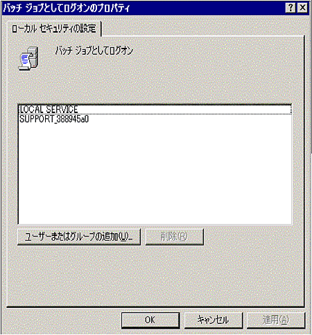 表1:必要な設定 1.環境変数%TEMP%,%TMP% ディレクトリへの権限をEnterprise Manager用のユーザーに与えます。デフォルトでは%TEMP%,%TMP%はC:\WINNT\TEMPになっていますので、該当フォルダーを右クリックし、「プロパティ」の「セキュリティ」タブで権限を与えてください。 ![]() 2.「バッチジョブとしてログオン権限」をEnterprise Manager用のユーザーに与えます。管理ツールの「ローカルセキュリティポリシー」をクリックします。「バッチジョブとしてログオン」に対し権限を付与してください。 「スタート」->「管理ツール」->「ローカルセキュリティポリシー」で上記画面を表示し、「ユーザー権利の割り当て」の「バッチジョブとしてログオン」を右クリックし「セキュリティ」を選択します。