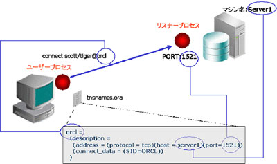 ネットワークの設定情報は、サーバー側のリスナー情報を構成するLISTENER.ORAとクライアント側の接続情報を記述するTNSNAMES.ORAというファイルに記述されています。これらは以下の図のような関係になります。