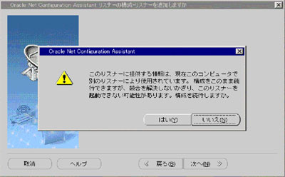 Enterprise Managerの実習にてリスナーを起動したままの状態の場合は、上記のメッセージが表示されます。この場合は構成が終了後に、Windows のサービスよりリスナーを再起動してください。