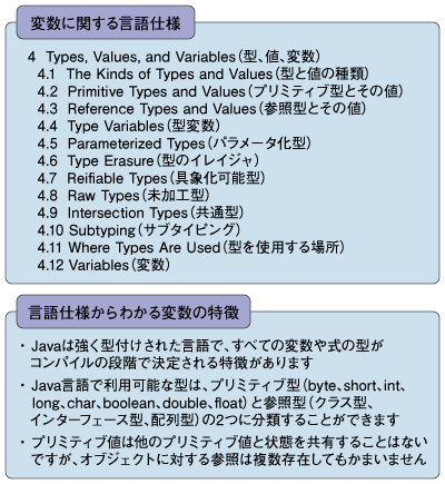 監修から一言 観衆^h^h監修の高安です。本記事はオープンストリームのアーキテクトのメンバー3人に第2回〜第4回までを書いてもらいました。3人が3人ともJavaのスペシャリストですが、それぞれ特徴があるので私としても記事が楽しみです。 第2回は検証が非常にうまい松下さんの担当です。ミドルウェアの検証のときは某ミドルウェアベンダーの人がうれしい悲鳴をあげただろうなと思った技術者です。Java技術の網羅性やバランス感覚の高い彼がどのように言語仕様を語ってくれるか楽しみです。 第3回はLinuxなどのプラットフォーム技術が好きで、プラットフォームの詳細までよく知っている鍋倉さんです。細かい仕組みまで理解しないと満足しない彼がOSと密接にかかわりあうスレッドに関して、言語仕様を基に語ってくれるのが楽しみです。 第4回は難しい技術をわかりやすい図・表現で説明してくれる技術者上野さんです。彼のテーマは例外処理ということで、初心者が一番つまずきやすい例外に関して、仕様を基にどう料理してくれるかが楽しみです。それではさっそくJavaの言語仕様についてみていきましょう。 型、値、変数に関する言語仕様 どのようなプログラミング言語であっても、値を保持するためには変数の存在が欠かせません。変数を理解することでプログラミング言語の特徴がみえてくるため、入門書でもまず変数について詳しく説明していることが多いのではないでしょうか。 Javaの場合、変数に関する言語仕様には、 ![]() のような特徴があります。 これらの特徴はJavaの言語仕様の「4 Types, Values, and Variables(型、値、変数)」と「5 Conversions and Promotions(変換と格上げ)」にまとめられています。多くの入門書は仕様についてわかりやすく説明しているため、わざわざ英語の言語仕様を読む必要はないと感じる読者の方も多いかもしれません。 では、ここで1つ問題です。 どのオブジェクトも参照していないことをあらわすnullという値があります。皆さんはnullがどの型に分類されるかご存知でしょうか? 参照型に決まっていると思った読者の方は落とし穴にはまっています。筆者も言語仕様を読むまでは参照型だと思い込んでいました。 言語仕様の「4.1 The Kinds of Types and Values(型と値の種類)」には、「There is also a special null type, the type of the expression null, which has no name. Because the null type has no name, it is impossible to declare a variable of the null type or to cast to the null type. The null reference is the only possible value of an expression of null type. The null reference can always be cast to any reference type. In practice, the programmer can ignore the null type and just pretend that null is merely a special literal that can be of any reference type.(訳:式nullの型である、名前を持たない特殊なnull型という型が用意されている。null型には名前がないため、null型の変数を宣言したり、null型へとキャストすることはできない。null型の式の値として許されているのはnull参照のみである。またnull参照は、常に任意の参照型にキャストすることができる。このためプログラマは、null型を事実上無視し、nullを単に任意の参照型として扱うことのできる特別なリテラルとして考えることができる)」とあります。 nullは、参照型としても扱えるため参照型と思っている方も多いかもしれませんが、言語仕様ではnullはnull型という特殊な型として定義されているのです。 参照型じゃなくてnull型と知っていたから何だと思うかもしれません。しかし、これはあくまでも一例なのです。入門書には仕様の説明と利用方法が書かれていますが、言語仕様にはさらに内部の仕組みまでも詳細に説明されています。 本記事では、実装時に直面しやすいいくつかの問題や疑問に答えながら、型、値、変数に関する言語仕様を読み解いていきましょう。まずは「プリミティブ型の値の計算でなぜキャストが必要か?」について言語仕様をみながら解説していきます。 |