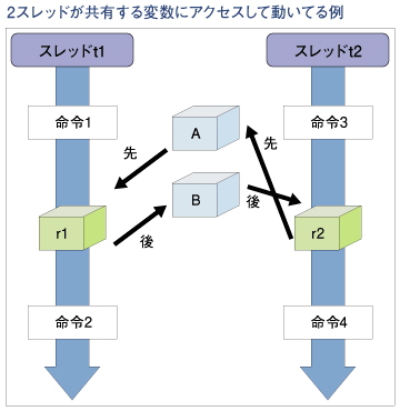 スレッドを読み解く! サーバサイドJavaアプリケーションでは、スレッドを意識することもあまりありません。しかし、クライアントアプリケーションやGUIを使用しているアプリケーションなどでは、画面表示と処理を平行して行ったり、同期を取ったりなど、マルチスレッド処理が必要になってきます。 読者のみなさんの中には「マルチスレッドプログラミングは難しい」そんなイメージを持たれている方は多いのではないでしょうか? 確かに、シングルスレッドの場合と比べて考慮すべき点(デッドロック・同期・リソースの競合など)が多くあります。また想定もしていなかった不思議な現象(変数の予期していない変更、タイミングによると思われる再現頻度の低い不具合)に悩まされてしまうこともあるでしょう。 例えば、2つのスレッドがあるとします。スレッドt1にはローカル変数r1があり、スレッドt2にはローカル変数r2があり、AとBの2つの共有する変数にアクセスできるものとします。はじめはA==B==0であるとします。 スレッドt1はr1にAを代入(命令1)、Bに1を代入(命令2)を実施します。スレッドt2はr2にBを代入(命令3)、Aに2を代入(命令4)を実施します。 ![]() 我々の感覚からすると命令1と命令3が実行されて、次に命令2と命令4が実行されることを期待してしまいがちです。よって結果は、r1==1かつr2==1にはならないと思えます。しかし、実際にはr1==1かつr2==1となってしまうことがあります(必ずしもなるとも限りません)。 この話は言語仕様の「17.3 Incorrectly Synchronized Programs Exhibit Surprising Behaviors(同期化をあつかったプログラムは意外な振る舞いをみせる)」から引用した事例です。原因は次のように書かれています。 However, compilers are allowed to reorder the instructions in either thread,when this does not affect the execution of that thread in isolation.(訳:コンパイラは、各スレッドの実行を個別に解釈し、その実行に影響が及ばないと判断できた場合には、双方のスレッド中の命令を並べ替えることが許されているのである)。 すなわち、命令1と2を入れ替えても良いとコンパイラが判断したために、このような問題が起きたことが理解できます。これは、コードの同期化(後述)が不適切であったためです。 これらの動作は決してJavaVMがおかしい動作をしているわけではなく、むしろJavaVMがJava言語仕様に則った動作をしているからこそ起きることなのです。では、Java言語仕様ではスレッドの動作についてどのような規定をしているのでしょうか? その答えを求めて、Java言語仕様のスレッドの記述を読み解いていきましょう。 |